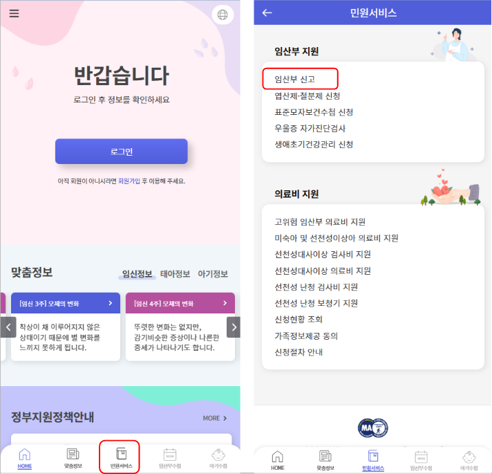 민원서비스 > 임산부지원 > 임산부신고2️⃣ 임산부 신고 메뉴 찾기앱 메인 화면에서 ‘👶 임산부 지원’ 또는 관련 메뉴 선택 → ‘임산부 신고’ 항목 클릭