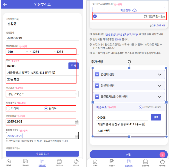 임산부신고 항목 입력 및 서류 첨부4️⃣ 신고 정보 입력 (약 3~5분 소요)이름, 주민등록번호, 현재 주소, 연락처, 마지막 생리일 또는 출산 예정일 등 기본 정보 입력 임신 확인 서류 첨부병원 발급 ‘임신확인서’ 또는 ‘산모수첩(임신 내용 포함)’ 준비 → 앱 내 ‘사진 촬영’ 기능으로 바로 촬영하여 첨부