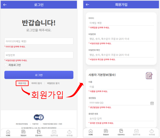 아이마중 앱 회원가입 or 로그인 화면 1️⃣ 아이마중 앱 다운로드 및 실행구글 플레이스토어 또는 애플 앱스토어에서 ‘아이마중’ 검색 후 설치 → 앱 실행 후 회원가입 또는 로그인 진행